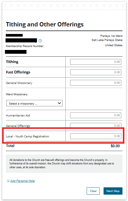 Fill out the online registration and release form below. There is also a $75 registion fee that you can pay online through your individual church donations account (See the image below on where to pay). Click here to pay online. Or you can give a check to your ward clerk.